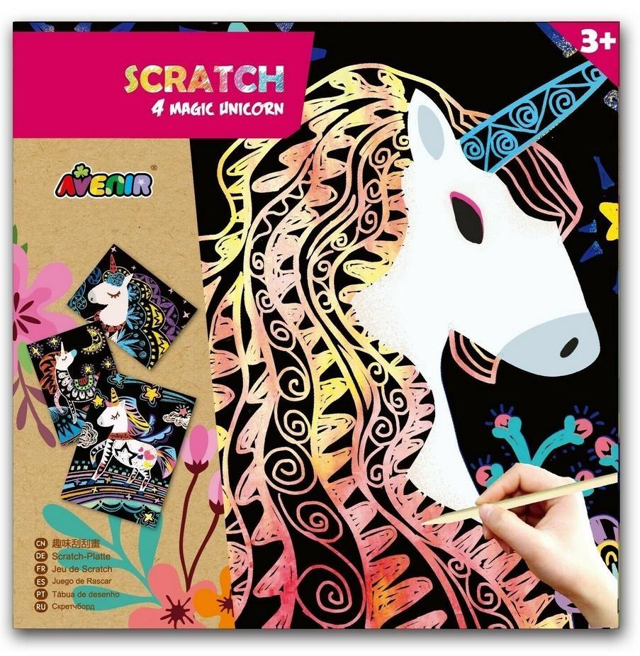 Avenir Scratch to zupełnie nowe podejście do prac ręcznych. Wyjątkowy arkusz, na którym tworzy się poprzez zdrapywanie warstwy wierzchniej, by odsłonić wielobarwną warstwę spodnią. Zabawka kreatywna najwyższych lotów, pozwalająca nie tylko tworzyć piękne prace, ale także dająca doświadczenia sensoryczne - dzięki użyciu odpowiedniego narzędzia i zachowywania się papieru podczas zabawy dziecko odbiera nowe wrażenia dotykowe. W zestawie są 4 magiczne jednorożce oraz patyczek do zdrapywania. Dla dzieci powyżej 3. roku życia. Opakowanie: 23 x 23 cm.