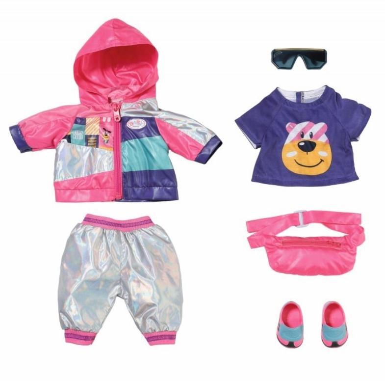 Tuuut! Tak brzmi sygnał do startu w wyścigu rowerowym Tour de BABY born. Mała zawodniczka zwraca na siebie uwagę stylowym trykotem. Na kurtce z kapturem widnieją jakże modne geometryczne kształty. Podobne motywy zdobią jej przeciwsłoneczne okulary. Kurtka idealnie pasuje do ciemnej koszulki z portretem niedźwiadka Bruno. Ponad butami sportowymi połyskują spodnie - mienią się w słońcu, niczym zdobyty w rywalizacji medal. W różowej saszetce na pasku BABY born schowała dokument potwierdzający udział w wyścigu