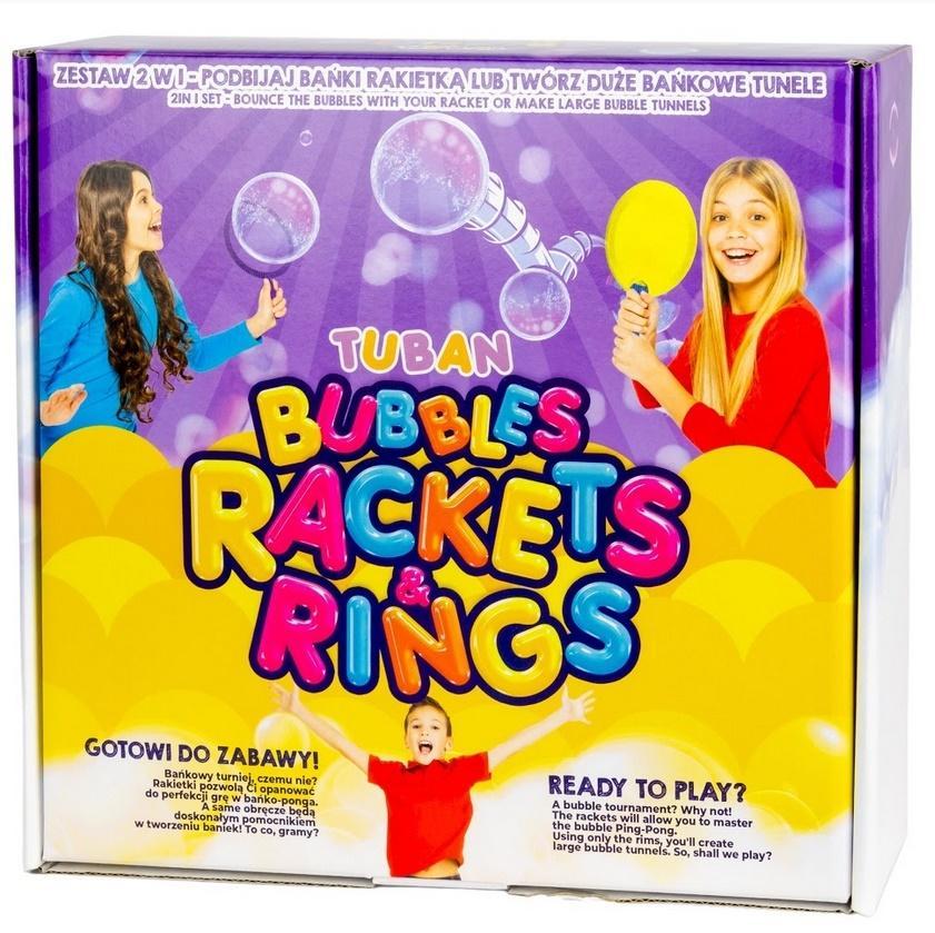 BAŃKOWE RAKIETKI I OBRĘCZE Zestaw zawiera: słomkę do dmuchania baniek, płyn do baniek 250 ml, talerzyk, 2x materiałowa nakładka na obręcz, 2x obręcz. Wiek 3+