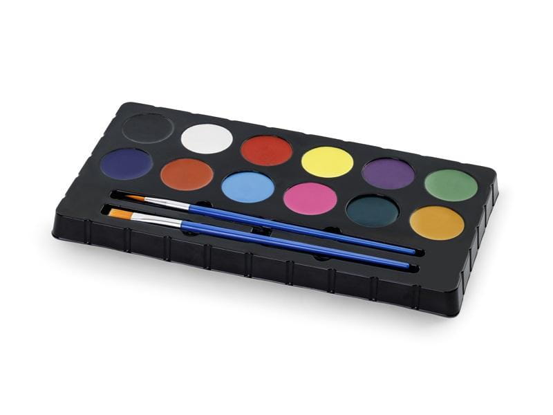 Farbki do malowania twarzy, zestaw zawiera 2 pędzelki oraz składa się z 12 kolorów: jasny zielony, ciemny żółty, ciemny zielony, fioletowy, żółty, różowy, czerwony, błękitny, biały, brązowy, czarny, granatowy.