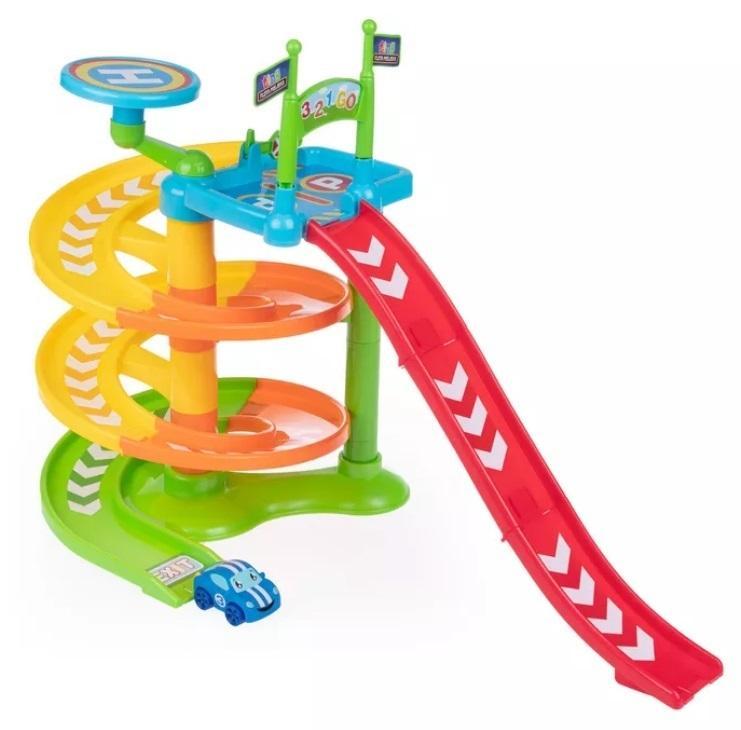 Rozpędź się do kolorowej zabawy, zjeżdżając zakręconym torem w dół! Ten duży zestaw elementów pozwala na zbudowanie zjeżdżalni o wysokości 37 cm. Poza torem do zjazdu, znajdziemy tu kilka dodatkowych elementów, które urozmaicą zabawę: ruchomy szlaban, miejsce parkingowe, oraz znajdujące się na szczycie zabawki, lądowisko. Do zestawu dołączony jest jeden, miękki w dotyku mini samochodzik. Zabawkę można rozbudować, dokupując oddzielnie inne produkty z serii Flota Miejska Tiny, Lawetę z autkiem oraz pojedyncze Pojazdy Mini, które występują w aż 8 różnych wzorach. W serii znajduje się także zabawka dla starszych dzieci, Garaż Deluxe.
