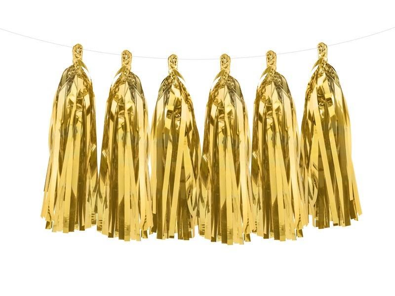Girlanda frędzle, do samodzielnego złożenia, zestaw zawiera 12 frędzli w kolorze złotym lustrzanym i ok. 2 m białego sznurka, wymiary po złożeniu: wysokość ok. 30 cm, długość ok. 1,5 m.
