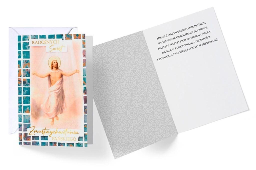 Karnet wielkanocny, posiada delikatne złote zdobienia. Kartka posiada tekst w środku, dołączona jest do niej koperta.