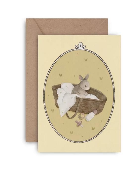 Projekt wykonany przez ilustratorkę Agnieszkę Kumańską przedstawiający malutkiego zajączka w koszu Mojżesza, obraz wywołuje czułość i beztroskę nowo narodzonego życia, co czyni ją idealnym wyborem na taką okoliczność. Motyw wykonany w stylu retro, przyciąga wzrok i serce dodając kartce ponadczasowej elegancji. Każda kartka jest świadectwem ręcznej pracy artystycznej, co nadaje jej niepowtarzalny charakter.