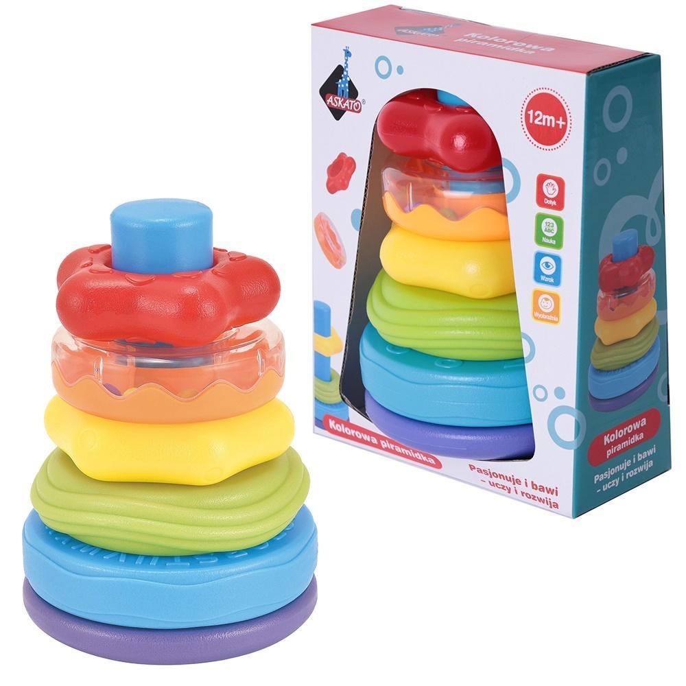 Kołysząca się piramidka sprawi mnóstwo frajdy każdemu maluszkowi i przyśpieszy rozwój zdolności manualnych. Piramidka składa się z 5 różnych krążków w różnych rozmiarach, fakturach i kolorach co urozmaici maluchom zabawę. Jeden z krążków jest przeźroczysty i wydaje dźwięki. Krążki można układać w stos od największego do najmniejszego zdejmować i ponownie układać. Różne faktury na krążkach stymulują zmysły dziecka, a układanie ich zachęca do logicznego analizowania i myślenia. Soczyste, żywe kolory z pewnością rozbudzą ciekawość i przykują uwagę każdego malucha.