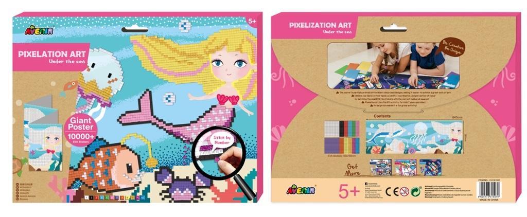 Piksele to nowy wymiar zabawy z Avenir. Do dyspozycji dziecka jest niesamowity gigantyczny plakat wydrukowany w żywych kolorach i z interesującą grafiką podwodnego świata. Zadaniem dziecka jest dopasować małe naklejki do odpowiednich ponumerowanych kwadratów, aby ukończyć pikselowe arcydzieło. Zabawa wspomaga koordynację ruchową i uczy rozpoznawania liczb oraz cierpliwości. W zestawie: duży plakat z motywem morza (wymiary: 84 x 29 cm), 800 naklejek z pianki EVA. Wiek 7+