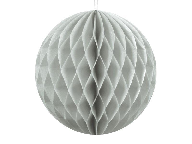 Kula bibułowa w kolorze jasnoszarym o średnicy ok. 10 cm.