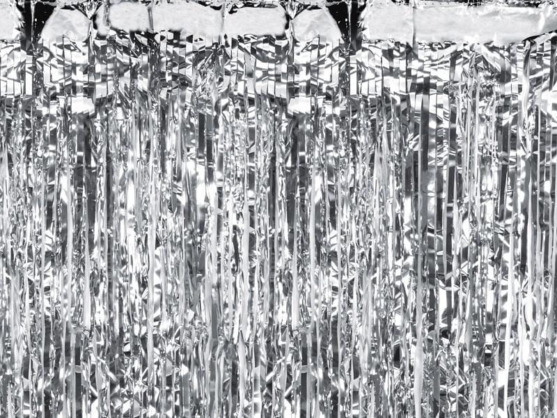 Kurtyna Party metalizowana w kolorze srebrnym, szerokość ok. 100 cm, wysokość ok. 200 cm. Wykonana z folii o grubości 23 um.