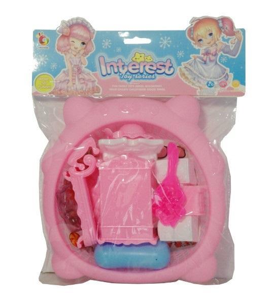 Zestaw kolorowych mebelków dla lalek jak m.in.: szafa, łóżko, sofa, szafki nocne. Wszystkie elementy zapakowane są w plastikowy koszyczek. W zestawie także naklejki.