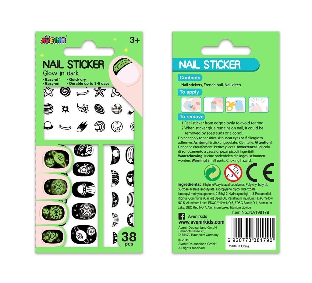 ucieszy każdą małą fankę mody. Świecące w ciemności naklejki z motywem kosmicznym są łatwe w aplikacji oraz ściągnięciu, utrzymują się na paznokciach dziewczynki przed 3-5 dni i są w pełni bezpieczne dla skóry dziecka.