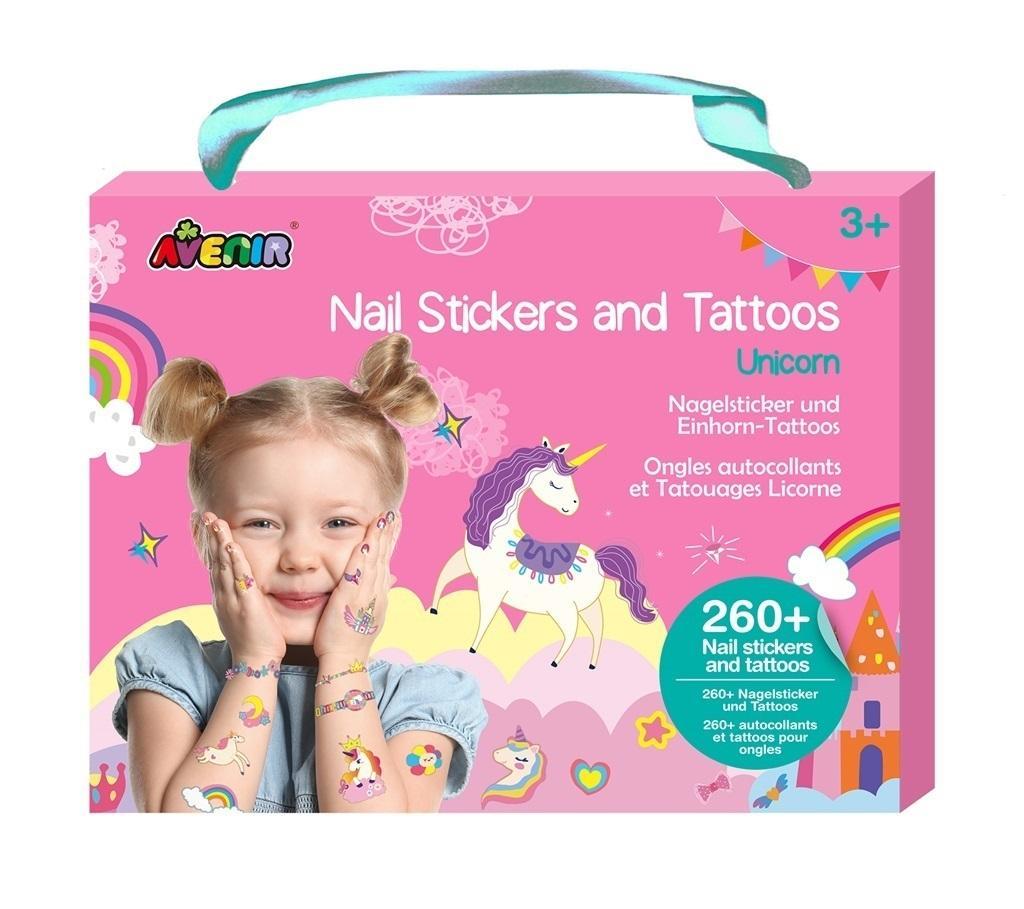 Super modne, kolorowe naklejki na paznokcie i tatuaże w przepięknych wzorach z jednorożcami. W zestawie 3 duże arkusze z 260 naklejkami i tatuażami. Łatwe w użyciu i usuwaniu.