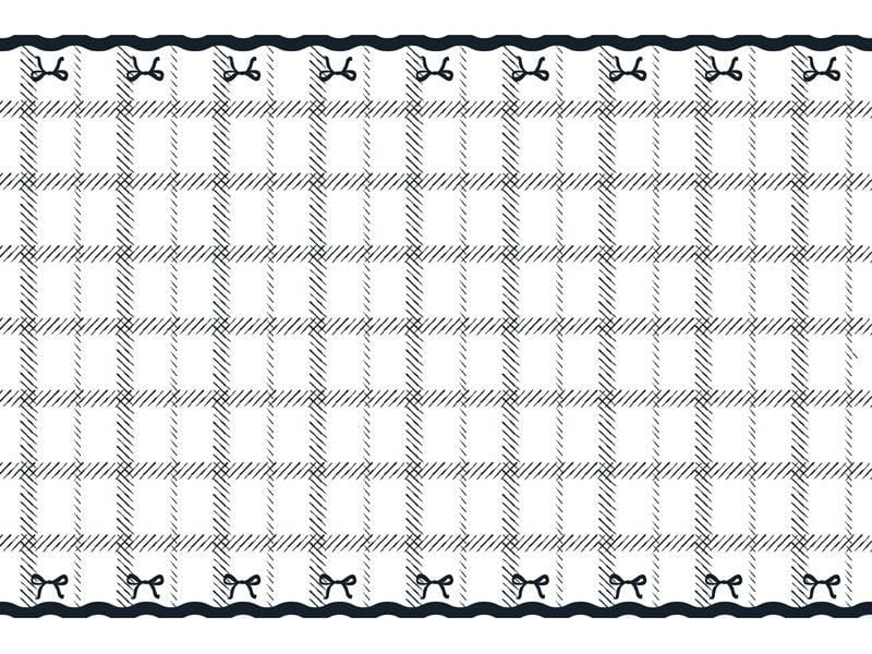 Obrus jednostronny i jednorazowy o długości 180 cm i szerokości 120 cm, mix kolorów. Obrus z nadrukowanymi czarnymi kokardkami i kratką.