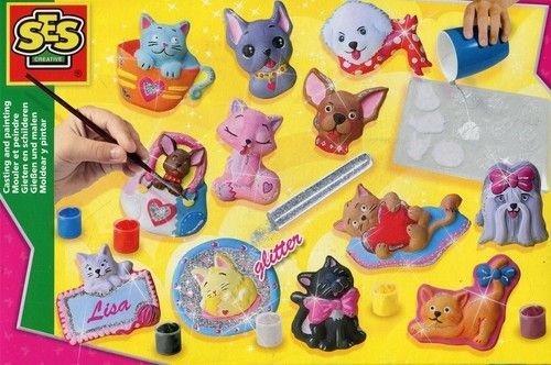 Zestaw zawiera dużą foremkę do odlewu figurek piesków i kotków, farbę w 6 kolorach, pędzel, brokat i gips.
