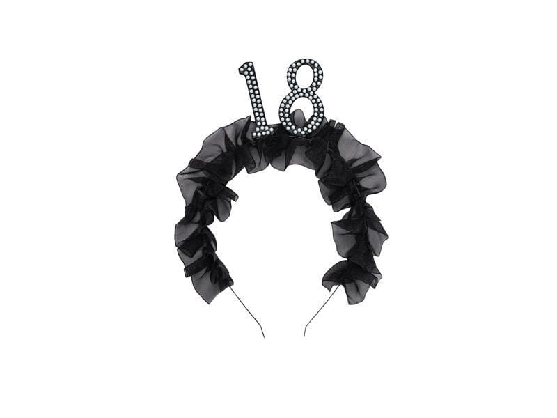 Opaska z czarną, materiałową falbanką oraz liczbą 18 udekorowaną perełkami. Rozmiar całościowy ok 12 x 19,5 cm. Wysokość samej liczby ok. 5,3 cm