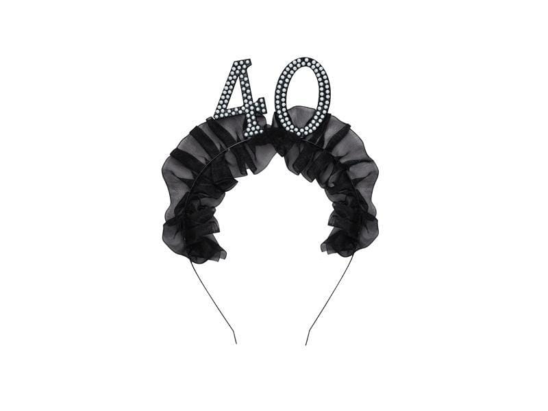 Opaska z czarną, materiałową falbanką oraz liczbą 40 udekorowaną perełkami. Rozmiar całościowy ok 12 x 19,5 cm. Wysokość samej liczby ok. 5,3 cm