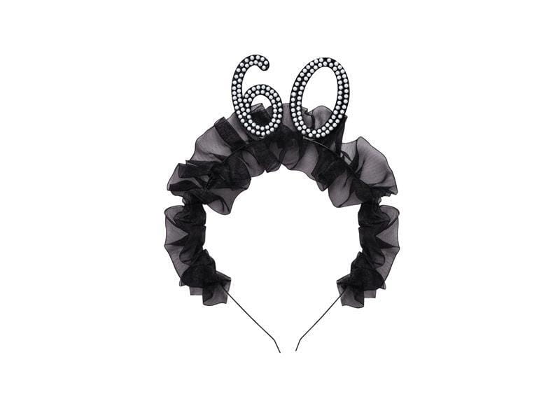 Opaska z czarną, materiałową falbanką oraz liczbą 60 udekorowaną perełkami. Rozmiar całościowy ok 12 x 19,5 cm. Wysokość samej liczby ok. 5,3 cm