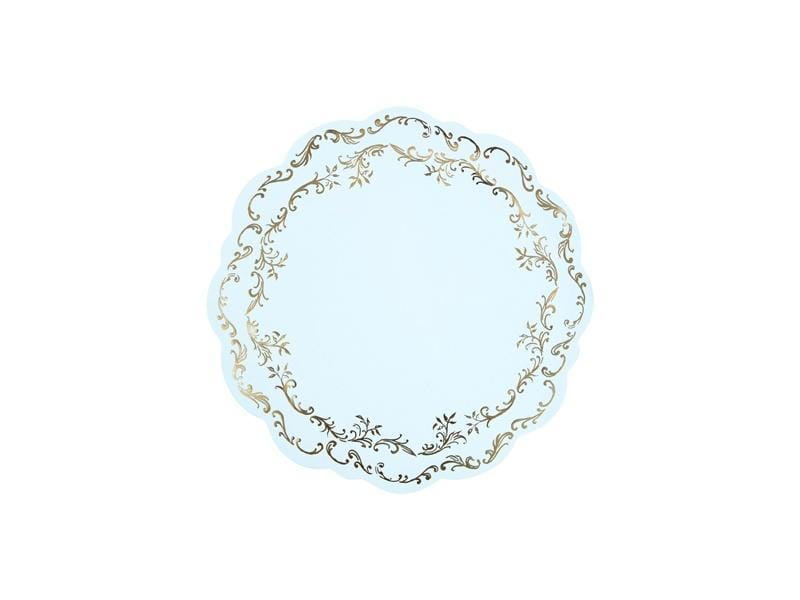 Jednostronne podkładki pod talerze ze złotym Ornamentem w kolorze błękitnym. Średnica ok. 35,5 cm. Zestaw zawiera 6 podkładek. Produkt jednorazowego użytku. Wykonane z wodoodpornego syntetycznego papieru.(1 op. / 6 szt.)
