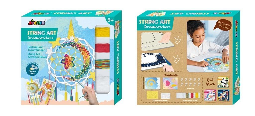 W zestawie znajdziecie szablon z perforowanej kolorowejtektury. Dziecko najpierw musi wbić plastikowe nity w odpowiednie miejsca inastępnie oplatać nity muliną, tworząc dekorację.