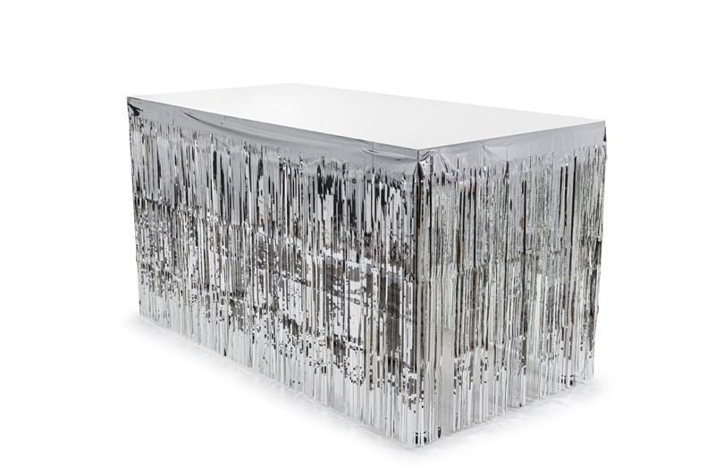 Skirting foliowy metalizowany z frędzlami w kolorze srebrnym, szerokość ok. 300 cm, wysokość ok. 80 cm.