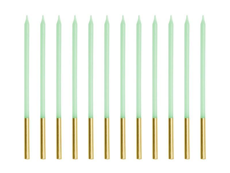 Świeczki urodzinowe gładkie w kolorze jasnozielonym, wysokość ok. 14 cm. Zestaw zawiera 12 świeczek.(1 op. / 12 szt.)