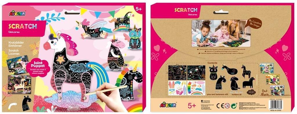 Wydrapywane jednorożce to ciekawa propozycja dla kreatywnych dzieci. Prosta technika wydrapywania pozwala na stworzenie przepięknych oryginalnych figurek przy niewielkim nakładzie pracy. Zdrap i stwórz 6 uroczych jednorożców z ruchomymi elementami. W zestawie: 2 obrazki-wydrapywanki ze sceneriami, elementy do stworzenia 6 kukiełek, patyczek do wydrapywania