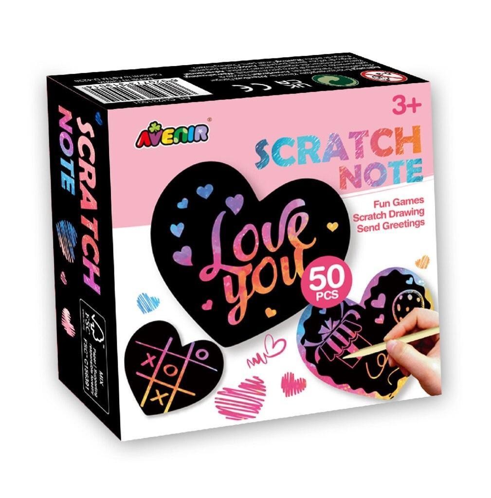 Notes z wydrapywankami to ciekawa propozycja dla kreatywnych dzieci. Prosta technika wydrapywania pozwala na stworzenie przepięknych oryginalnych obrazków i kartek przy niewielkim nakładzie pracy. Zestaw z notesem zawiera aż 50 stron w kształcie serca , na których dziecko może stworzyć dowolne notatki albo rysunki. W zestawie: 50 stron do wydrapywania, dwa patyczki, szmatka do wycierania.