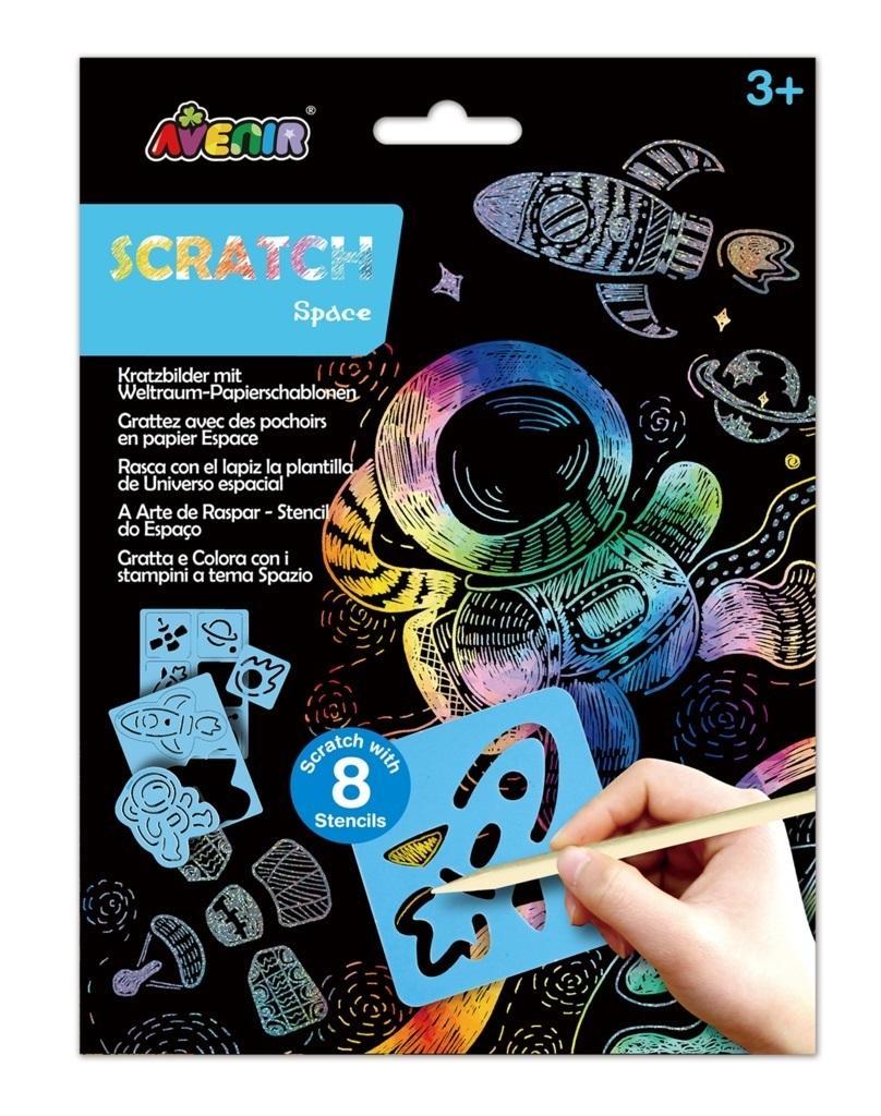 Avenir Scratch to zupełnie nowe podejście do prac ręcznych. Wyjątkowy arkusz, na którym tworzy się poprzez zdrapywanie warstwy wierzchniej, by odsłonić wielobarwną warstwę spodnią. Zdrap 2 magiczne arkusze kosmosu, korzystając z 8 szablonów z motywami transportu. Do zestawu dołaczony również patyczek do zdrapywania oraz szmatka do wycierania.