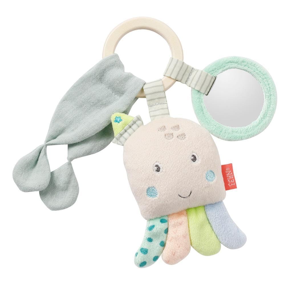 Zabawka do Rączki - Drewniany Chwytak, Ośmiornica z Kolekcji: Morze Drewniany Chwytak z Kolekcji: Morze, to wspaniała zabawka z drewnianym pierścieniem, bezpiecznym lusterkiem, muślinową tkaniną i grzechotką ukrytą we wnętrzu milutkiej Ośmiornicy, w sam raz dla malutkiej, delikatnej rączki niemowlaka i małego dziecka. Zabawka jest idealna do chwytania i przytulania, pobudza wyobraźnię i ciekawość, a także zmysły wzroku i słuchu. Rozwija pierwsze umiejętności motoryczne i sprawia, że serce małego odkrywcy zaczyna bić szybciej, Nocą zaś ukoi, wyciszy i pomoże zasnąć maluszkowi. Maskotka Ośmiornicy, wykonana z wyjątkowo miękkiego oraz delikatnego dla skóry dziecka materiału, szybko stanie się wiernym towarzyszem w domu i w podróży, zawsze zapewniając dobry nastrój! Funkcje: Chwytak do trenowania świadomego chwytania. Grzechotka: zachęca do zabawy, rozwija koncentrację i małą motorykę. Pobudza wyobraźnię, rozwija zmysły wzroku i słuchu. Lusterko zachęca do poznawania swojej buzi. Różnorodne faktury materiału stymulują dotyk. Szczegółowe informacje o produkcie: Uroczy chwytak z drewnianym pierścieniem, lusterkiem, muślinową tkaniną i grzechotką w przytulnej maskotce. Możliwość prania w pralce w 30°C. Materiał wierzchni: aksamit, tkanina z nadrukiem, muślin. Wypełnienie: 100% poliester. Wielkość zabawki: 18 cm. Wymiary opakowania: 6 cm x 15 cm x 24 cm. Idealny prezent dla niemowląt i małych dzieci. Wszystkie zabawki niemieckiej marki FEHN są bezpieczne dla dzieci od 0 lat. Wykonane są z najlepszej jakości materiałów. Spełniają normy EN71, CE. Są testowane pod kątem bezpieczeństwa przez niezależne instytuty badawcze.